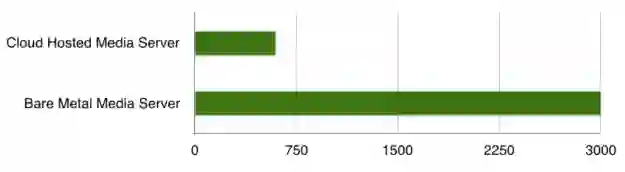 目前的大型VoIP设备可以支持10K—100K的流。有很多因素会影响媒体服务器可以支持的音频流,其中最主要的因素就是服务器平台。如下图所示,基于云的媒体服务器和经过优化的裸机服务器相比,裸机服务器明显胜出: