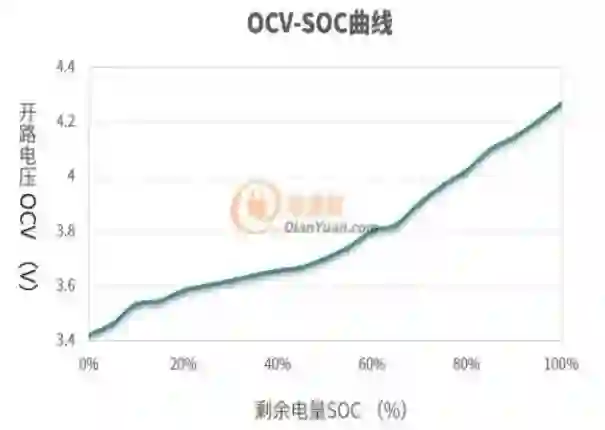 电池在长时间静置后测量到的电压称为开路电压OCV(open circuit voltage)。OCV与SOC存在一一对应关系,可以绘成OCV-SOC曲线,作为标尺。