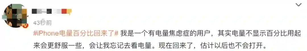 网友纷纷发现这一版本的「史诗级更新」:电池百分比又能显示了。