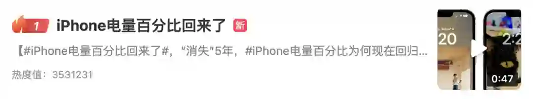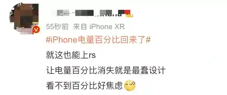 消失5年,iPhone电量百分比回来了,网友纷纷调侃「史诗级更新」。