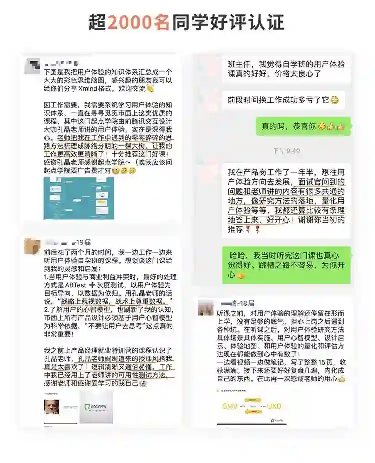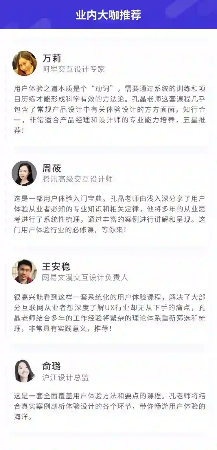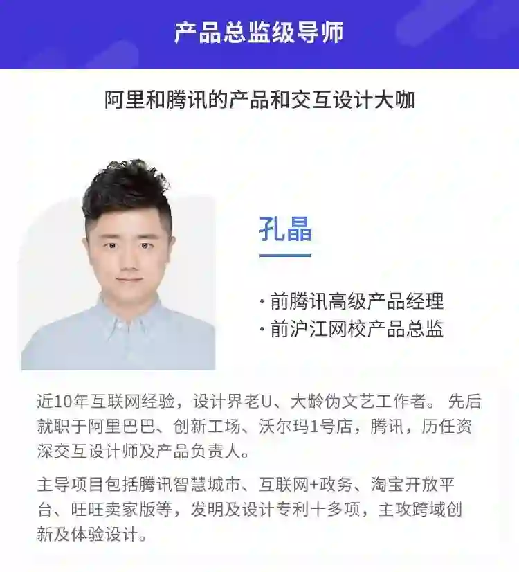 起点学院特邀前腾讯高级产品经理、前沪江网校产品总监@孔晶老师,研发了《用户体验训练营》这门课程,帮助大家全面系统地了解用户体验的研究方法和产品创新设计要点,从而提升用户体验素养的职业竞争力。