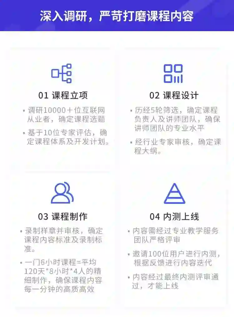 4. 完成系统的用户体验认知和职业素养提升。充分了解用户体验方向不同层级的岗位能力需求和工作内容,清晰职业定位,助力职场晋升。