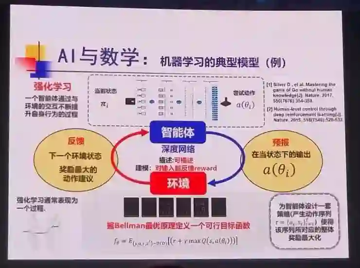 「那在这些模型中,数学和物理充当什么作用呢?以上图强化学习为例,智能体就正在解决一个数学问题,此刻它的环境就是给定的数学公式、定解条件或边界条件等。因此从本质上来看,人工智能、知识工程以及数学在解决问题时所使用的基本方法论其实是具有统一性的。」