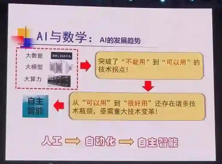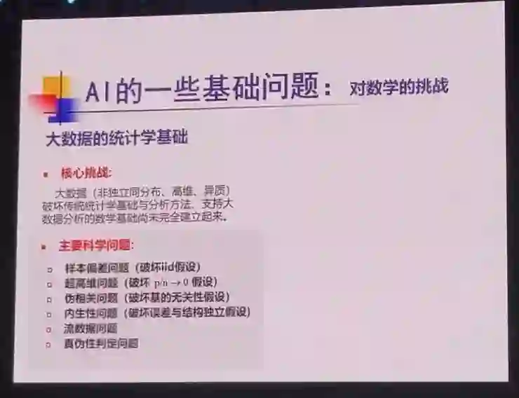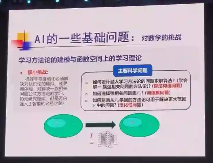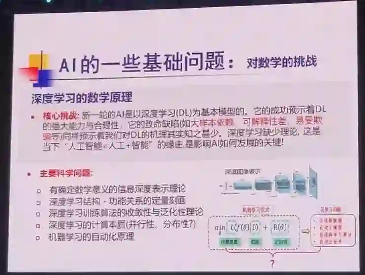 在开场前,他先从徐匡迪之问——「人工智能的基石在数学,我们有多少数学家投身进去了?」以及任正非答记者问时强调「人工智能的本质就是数学」的观点引入,表达了自己对于人工智能与数学之间的关系的看法:融通共进,一方面,人工智能的基础之一是数学,因此人工智能想要行稳致远,就必须先把数学的基本问题解决好;另一方面,人工智能的发展也对数学领域的研究产生了重要的推动作用。