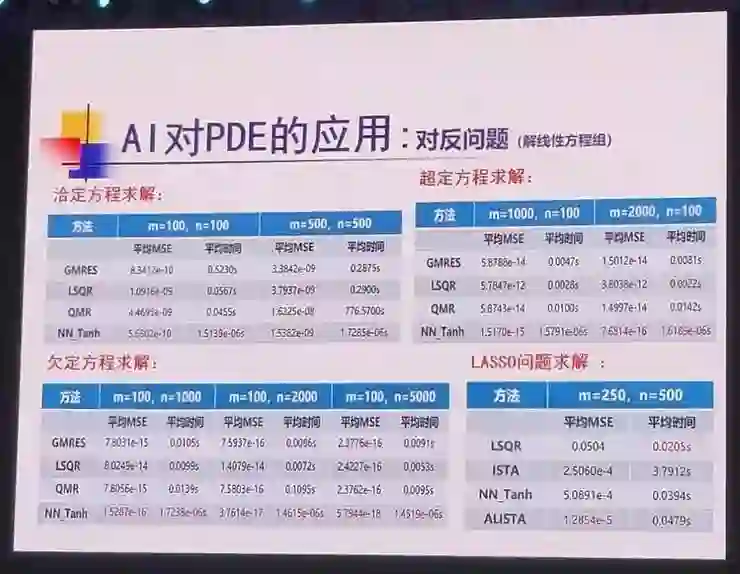 其次在解线性方程组的应用上,此前,Y=aX 作为线性方程组的基本公式,我们一定需要知道 a 的具体值以及是否可逆的等等。而现在深度学习则能够做到「不问东西」、「不问青红皂白」地直接给出解。