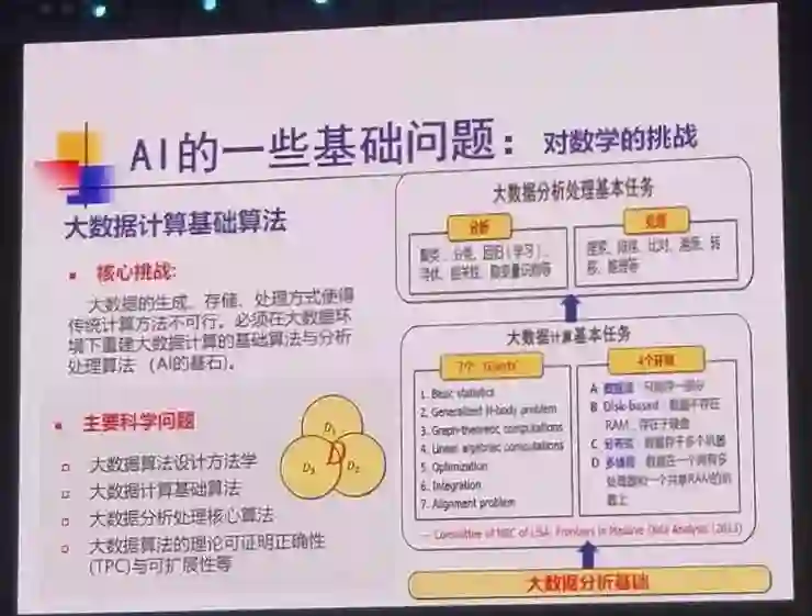 大数据一般应用于分析处理两类基本任务:一类是以计算机逻辑为基础的搜索、比对、排序、溯源等问题;一类是分析数据之间是否具有共性结构等的聚类、分类、回归等问题。这两类问题都以数学模型为基础。然而一些传统的计算,在大数据环境下都变成了全新的问题,因而针对大数据环境重建大数据计算的基础算法和分析处理算法,都成为当下亟待解决的问题。
