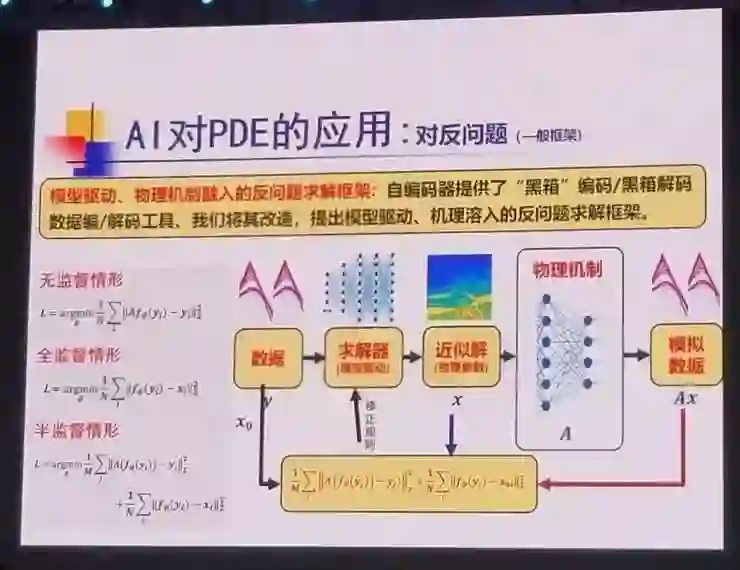 首先是受到编码器的启示,他对自编码器提供的「黑箱」编码、解码以及数据编码、解码的方法进行改造,提出了模型驱动、机理溶入的反问题求解框架,并由此提出解反问题的无监督学习、全监督学习和半监督学习的三种模式都采用这一框架去实现的观点。