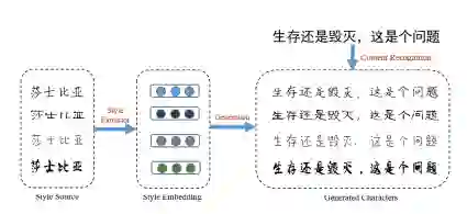 图 1:基于我们的方法的汉字生成过程描述。给定少量特定字体的样本(例如签名),我们推理不同字体的隐藏向量。然后,我们通过识别它们的内容在少量样本的基础上生成中文字体(「生存还是毁灭,这是个问题」),可以看到,用来训练的样本中,每个风格只有四个汉字(「莎士比亚」)。