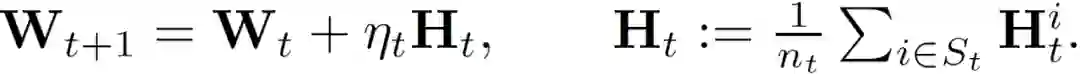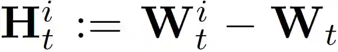 联邦学习的目标是从存储在大量客户端的数据中学习包含在真实矩阵 W 中参数的模型。在第 t 轮训练过程中,中央服务器将当前模型 W_t 分发给总共 n_t 个客户端的子集 S_t。这些客户端子集根据其本地数据独立训练并更新本地模型。具体介绍,第 i 个客户端的更新过程如下式所示: