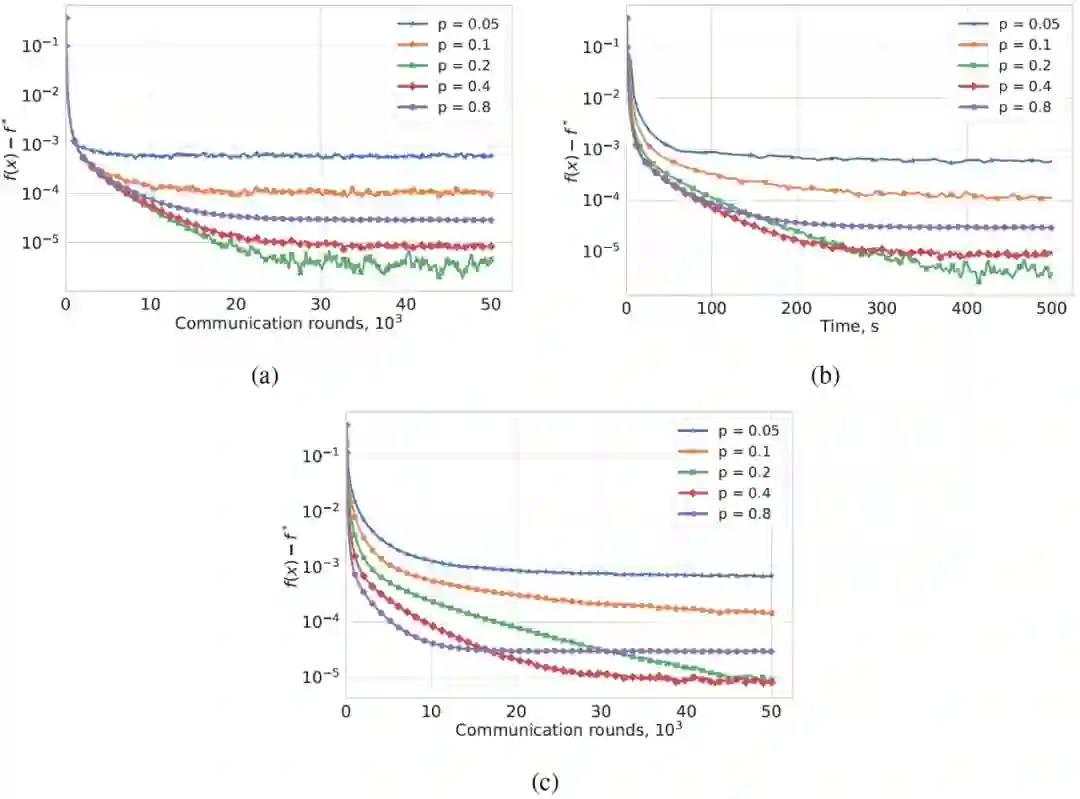 图 13. 梯度下降步长算法 2 的收敛性,λ=0.5,(a)梯度步长相同情况下,不同 p 值的通讯轮次数量,(b)梯度步长相同情况下,不同 p 值的计算时间,(c)梯度步长与 p 是成比例的,不同 p 值的通讯轮次数量。