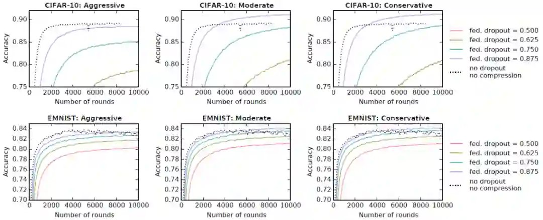 最后,作者进行了实验以验证将两种策略(有损压缩和 Federated Dropout)与客户端到服务器压缩方案(节 1.1.1 中文献 [1] 提出的方法)相结合时本文方法的效果。作者评估了本文模型在 3 种不同的压缩方案(Aggressive、Moderate 和 Conservative)和 4 种不同的 Federated Dropout 率(0.5、0.625、0.75 和 0.875)的表现。图 7 给出了 CIFAR-10 和 EMNIST 中的实验结果。重复每个实验 5 次,最终报告 5 次重复实验结果的平均值。对于所有三个模型,除了 Aggressive 压缩方案外,Federated Dropout 率为 0.75 时在所有压缩方案下都不会造成模型准确度下降。对于 MNIST 和 EMNIST,中央服务器到客户端的通信成本节省了 14 倍,客户端到中央服务器的通信成本节省了 28 倍,本地计算量减少了 1.7 倍,所有这些通信开销成本的节约都不会降低最终全局模型的准确性(有时甚至还能够提高准确性)。