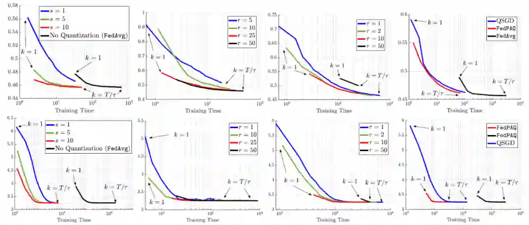 在图 10 中,前四个图展示了在 MNIST 数据集('0'和'8'位)上,T=100 次迭代的正则化逻辑回归问题的训练时间。联邦学习网络中共有 n=50 个客户端节点,每个节点加载 200 个样本。设置 C_comm/C_comp=100/1 来捕获通信瓶颈。第一列图中曲线显示了在中央服务器上每轮的训练时间与所获得的训练损失之间的关系。第二列图中曲线显示了参与更新的客户端数量 n 的影响。第三列论证了周期长度 τ 在通信 - 计算 tradeoff 中的作用。最后一列图比较了 FedPAQ 与其他两个基线方法 FedAvg 和 QSGD 的训练时间。后四个图为 CIFAR-10 数据库中神经网络的实验结果。具体图例与 MNIST 中结果相同。