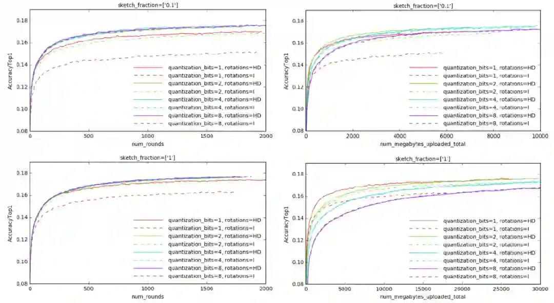 图 2. Sketching 比较,在 Reddit 数据上训练一个 LSTM 模型,每轮随机抽样 50 个客户端。