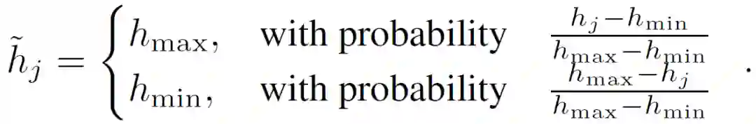 对于 4 个字节的浮点数,这种方法实现了 32 倍的压缩。对于一个比特的量化处理来说,首先均匀区分 [h_min, h_max] 为 2^b 个间隔。h_i 落在 h’和 h’’限定的区间内。量化操作将上述方程的 h_min 和 h_max 分别替换为 h’和 h’’。设定参数 b 以平衡准确度和通信成本,并通过随机化旋转改进量化。当尺度在不同维度上近似相等时,上述 1 比特和多比特量化方法效果最好。当 max=1,min=-1,且大部分值为 0 时,1 比特量化将会导致较大误差,一般可以通过在量化前对 h 进行随机旋转(h 乘以随机正交矩阵)来解决这个问题。在解码阶段,中央服务器需要在聚合所有更新之前执行反向旋转。