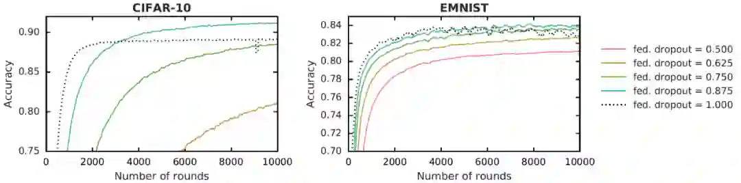 ,以及允许用户在全局模型的较小子集上高效完成本地训练的、能够同时减少客户端到服务器的通信成本和本地计算的 Federated Dropout。