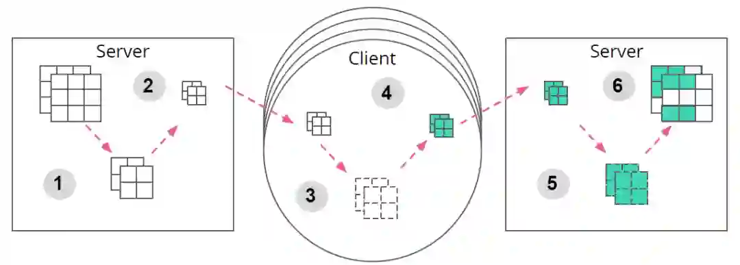 这篇文章中提出的 FetchSGD 使用 Count Sketch 来压缩模型更新,然后利用 Sketches 的可合并性来将不同客户端的模型更新进行合并。FetchSGD 设计中的一个关键问题是,由于 Count Sketch 是线性的,动量和误差累积都可以在 Count Sketch 中进行。这使得该方法能够将动量和误差累积从客户端转移到中央服务器中,从而在克服稀疏客户端参与挑战的同时,确保高压缩率和良好的收敛性。FetchSGD 的完整方法见图 8:(1)在客户端本地计算梯度,(2)将梯度的 sketches 发送到中央服务器中,中央服务器聚合梯度(3)sketches(4)动量和误差累积(5),(6)提取近似的 top-k 值,(7)中央服务器将稀疏值更新到参与下一轮训练的客户端设备中。