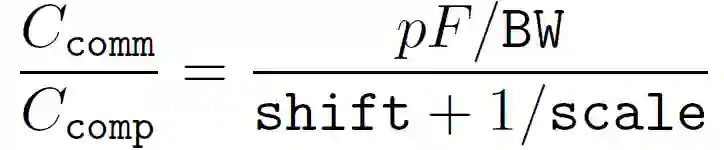 作者在实验中对比了通信开销和收敛性的 tradeoff 的结果分析。实验以总的训练时间为代价目标,包括通讯时间和计算时间。首先,定义网络带宽(Bandwidth,BW),每轮的通讯时间为上传的总比特数除以 BW。每轮的总比特数计算为 r ・ | Q(p,s)|,其中 | Q(p,s)| 表示根据具有 s 级(s levels)的特定量化算子对 p 维向量进行量化编码所需的比特数。在本文实验中使用的量化算子中,假定它需要 pF 位来表示长度为 p 的未量化向量,其中 F 为 32 位。然后,利用梯度计算时间的位移指数模型(Shifted-Exponential Model)确定计算时间。假设对于任何客户端,计算一个周期内的 τ 次迭代和批量大小为 B 的梯度需要确定位移 τ ・ B ・ scale^(-1) ,其中 shift 和 scale 分别是位移指数模型的位移和尺度参数,实验中 B 确定为 10。每轮的总计算时间就是 r 个贡献客户端节点中最大的本地计算时间。最后,计算通信 - 计算比为: