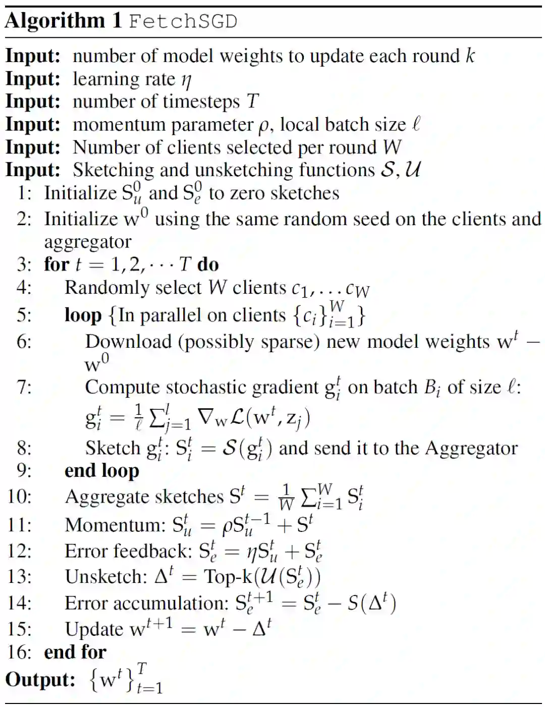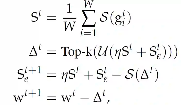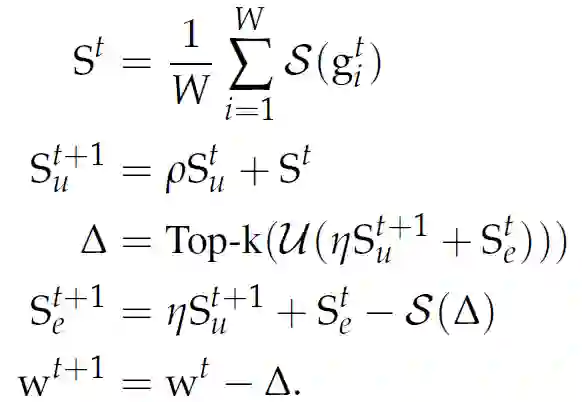 相比之下,其他有偏梯度压缩方法在压缩梯度时会给客户端带来偏差,因此客户端本身必须保持单独的误差累积向量。这在联邦学习中是很难保证的,这是由于客户端仅能参与一次更新,这样就没有机会在下一轮中重新引入错误。从另一个角度看,由于 S()是线性的,并且误差累积只包含线性操作,因此在 S_e 的中央服务器上进行误差累积相当于在每个客户端上进行误差累积,并将结果 Sketch 上传到中央服务器。更进一步,我们注意到动量也只包含线性操作,因此动量可以等价地在客户端或中央服务器上执行。推广上述方程可以得到: