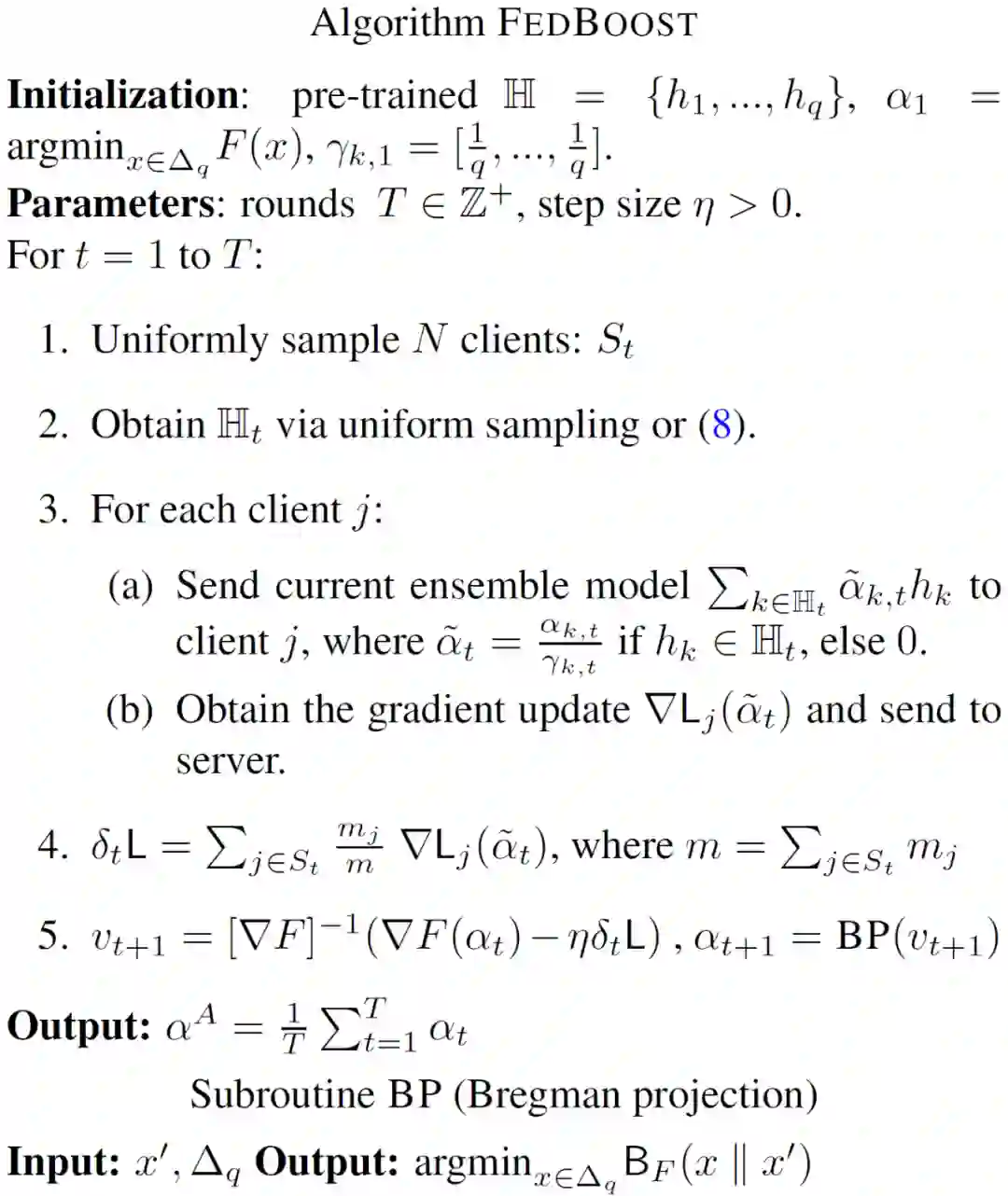 作者提出了任务无关的 AFLBoost 方法优化上述目标函数。AFLBoost 可以看作是 FedBoost 和针对任务无关损失函数的随机镜像下降算法 [7] 的结合。AFLBoost 的详细算法流程如下: