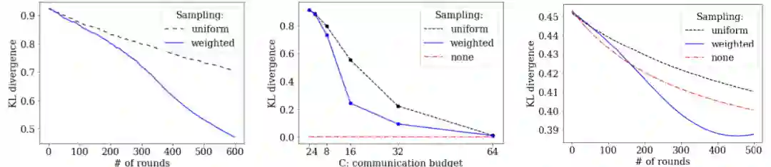 作者首先创建了一个 p=100 的合成数据集,其中每个 h_k 是单个元素上的点质分布(Point-mass distribution),初始化每个 α_k 为 1/p,混合权重λ遵循幂律分布(Power law distribution)。实验结果见图 11。由图 11 左,加权抽样的性能优于均匀抽样,两种方法的损失都在稳步下降。由图 11 中,在通信预算为 64 的情况下,不考虑通信效率均匀抽样和加权抽样的性能与 FedBoost 相同。此外,作者还在经典 Shakespeare 数据集中进行实验。如图 11 右,加权随机抽样比均匀抽样的表现更好,在这个库中加权抽样的表现甚至优于 FedBoost,具有更好的收敛性能。