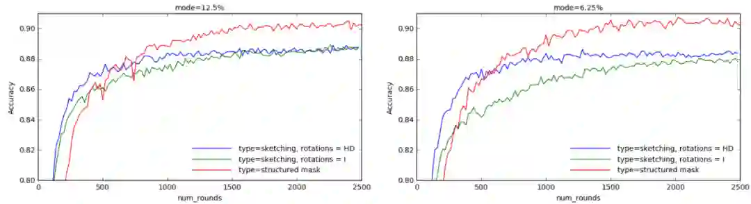 图 1. 在 CIFAR 数据库中结构化随机掩码更新和无量化 Sketched 更新的对比结果。