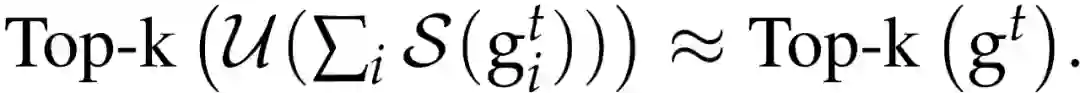 由于 Count Sketch 具备线性特性,中央服务器可以在给定 S((g_i)^t)的情况下,计算出每个小批量梯度 g^t 的 sketch: