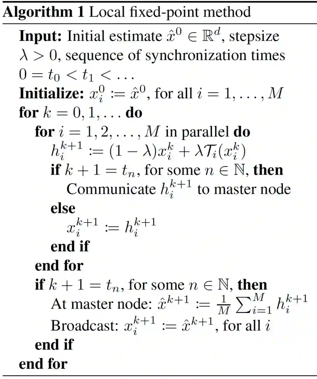 令(t_n)_n∈N 表示通信过程中的整数序列。在每次迭代过程中,操作算子Τ_i 应用于节点 i,并利用参数λ进行松弛。对于一定数量的迭代,M 个计算节点全部将其本地向量传输给中央服务器的主节点,主节点计算平均值并将平均值广播给全部节点。全部节点在新的一轮迭代开始时拥有相同的变量 (x^)^k。该算法是局部梯度下降法(Federated Averaging)的推广。