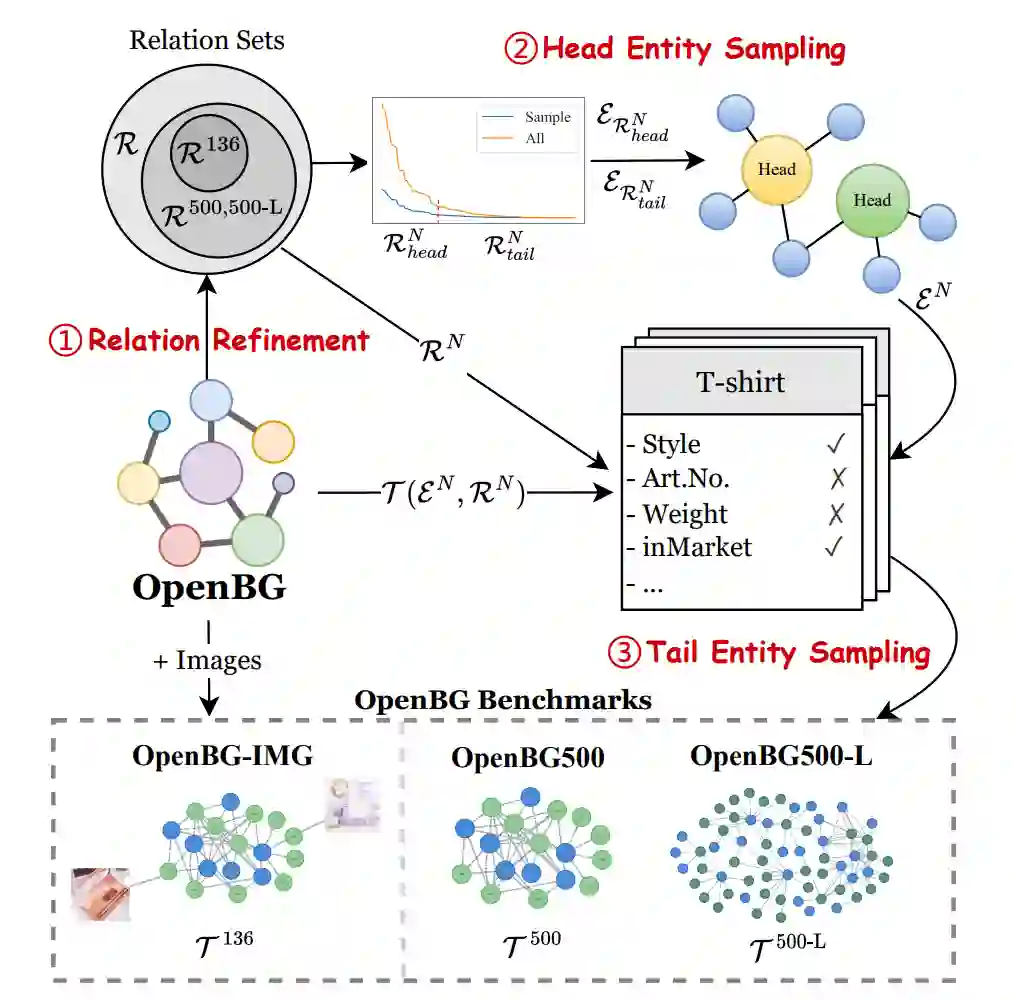 与商品常识显著性推理以及同款挖掘任务不同的是,链接预测任务由 3 个子任务数据集组成:OpenBG500、OpenBG500-L 和 OpenBG-IMG。其中 OpenBG500 包含 500 类关系,含百万级别规模的图谱数据;OpenBG500-L 在 OpenBG500 的基础上扩大了数据规模,含千万级别规模的图谱数据,是电子商务领域大规模的知识图谱;OpenBG-IMG 是电商领域的多模态知识图谱。3 个数据集均以 OpenBG 为基础构建,构建流程如下: