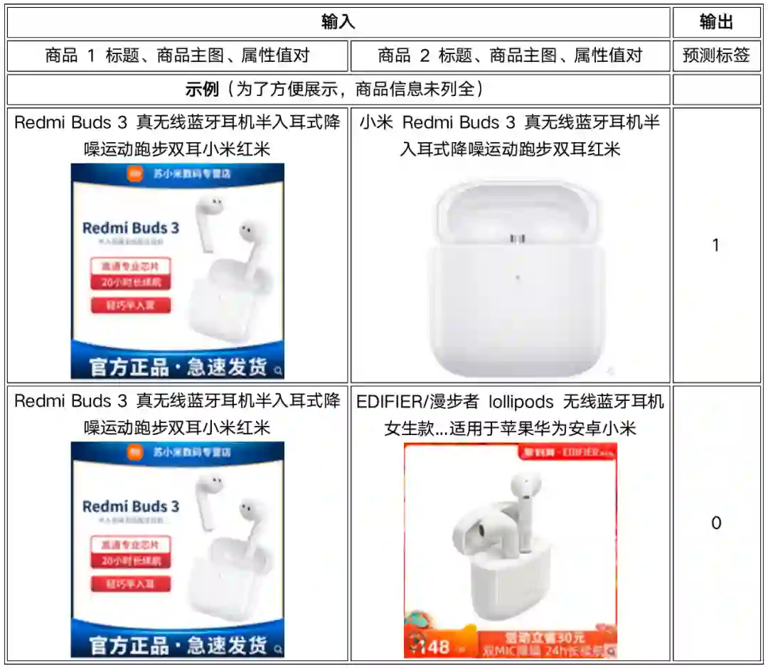 我们将商品同款识别任务定义为二分类任务,即给定商品对信息,判断商品 item 是否同款,示例如下: