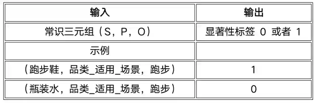 常识知识是被社会广泛承认的对同一事物普遍存在的日常共识。在电商场景中,显著性常识基于背后的知识体系,能为不同的用户推荐合适的商品,对用户体验和购物效率有重要的意义。现有的常识分类方法往往只注重评判常识是否合理,如 "跑步需要喝水"、"出差需要背包"。但当在电商平台搜索 "跑步" 时,瓶装水一般不是用户真实的购物意图,用户关注的商品一般是 “跑步鞋”、“跑步机” 等健身用品;在搜索 "出差" 时,“背包”一般并不是用户需要的商品,但 “旅行箱” 可能是符合用户意图的商品。显著的常识可以帮助搜索引擎有更好的理解能力,从而返回更贴合用户需要的商品。