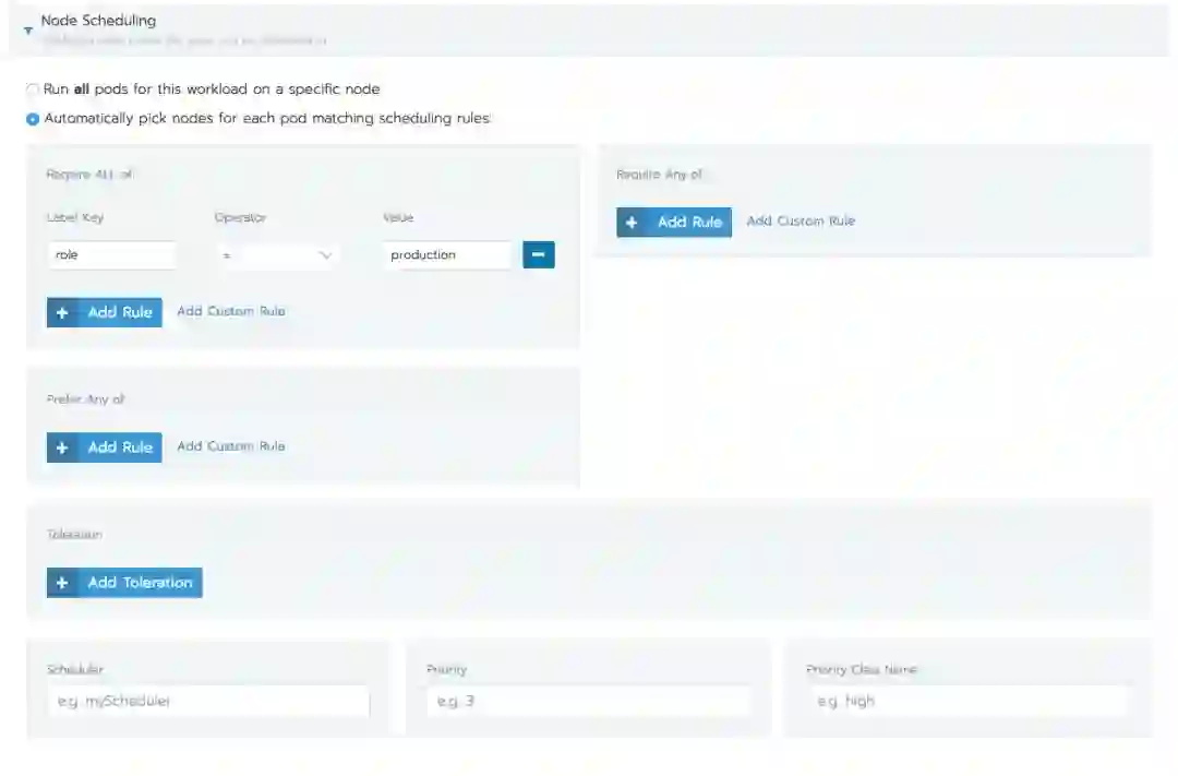 Rancher还允许您通过Kubernetes标签控制工作负载的调度。除了污点和容差之外,在部署工作负载时,您可以为主机设置必须、应该或可以具有的标签,这些标签会控制Pod的部署位置。 如果您的环境是静态的,您还可以将工作负载安排到特定节点。