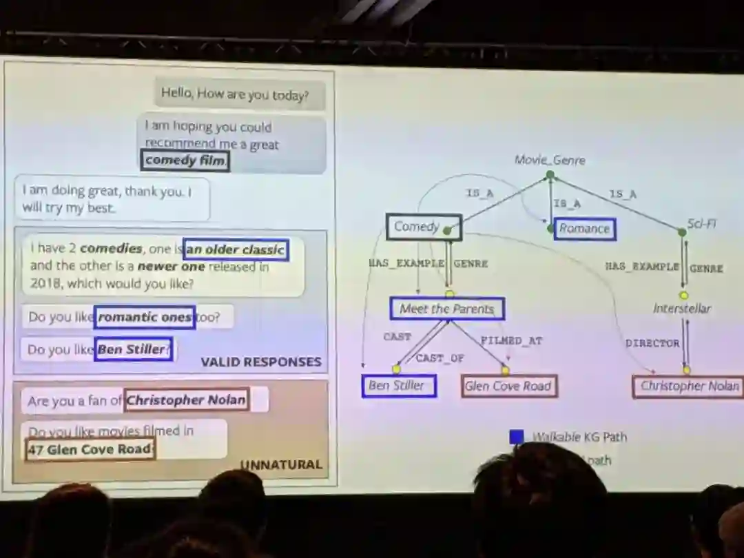说到对这种技术的预期,没有比 ACL 主席周明本人解释的更清楚了 - 在欢迎辞中,他强调了将知识图谱,推理和上下文融入到对话系统中的重要性。我还想补充一点:KG 可以提高智能体的答案的可解释性。因此,既然大会主席都提到了基于 KG 的对话系统,那么确实应该在这个领域做一些工作,对吧?是的,这正是我们现在在「Fraunhofer IAIS Dresden」( https://www.iais.fraunhofer.de/en/institute/dresden.html ) 和「Smart Data Analytics」( http://sda.cs.uni-bonn.de/ ) 研究小组所做的工作,致力于推动工业应用以及扩大基于 KG 的会对话平台的研究视野。