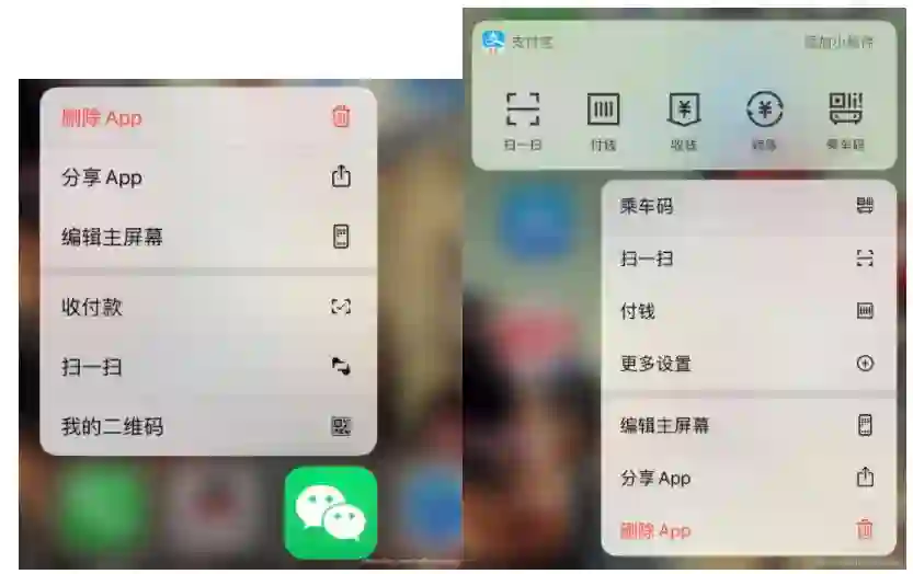 苹果在iPhone 6s和iPhone 6s Plus开始新增了3D Touch,这个功能褒贬不一,但我觉得还是特别好用的,特别是在微信上付款、加好友、扫二维码,或是在支付宝上付款等等场景。好用的真的是不要不要的,下面是苹果3D Touch的截图: