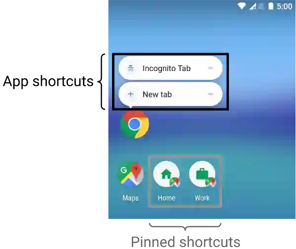 在Android 8.0(API级别26)及更高版本上,可以创建固定的快捷方式。与静态和动态快捷方式不同,固定的快捷方式在支持的启动器中显示为单独的图标。图1显示了这两种快捷方式之间的区别。