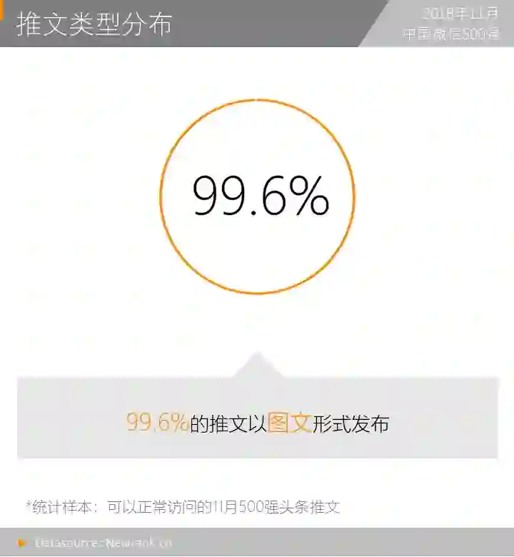 对500强11月头条推文中可以正常访问的22294篇内容进行统计,发现其中99.6%的内容(共计22201篇)是以图文的形式存在,剩余0.4%的内容为单独的视频推送、分享图片推送以及原创分享推送。