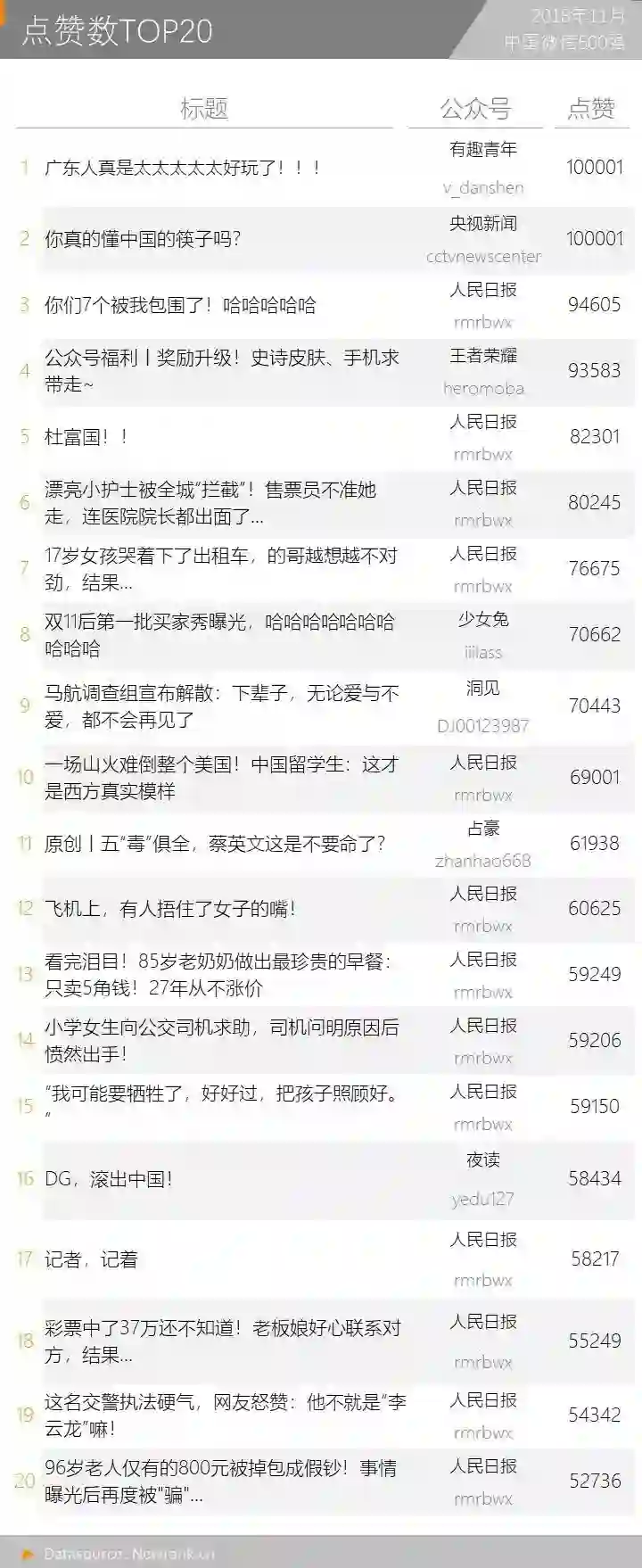 1.11 点赞数TOP20:“人民日报”13篇上榜