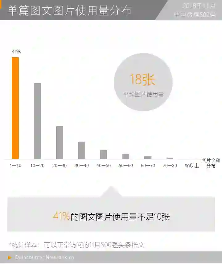 在上述以图文形式推送的22201篇内容中,新榜共获取到392412张图片,平均每篇内容中约包含18张图片。对单篇内容中包含的图片的数量进行分布统计,发现41%的图文使用的图片数量少于10张,仅有59篇内容使用的图片数量超过80张,这其中,使用图片数最多的内容为“深夜发媸”发布的《一百来块的大牌限量款,双11怎么能不买!》,共计使用219张图片。