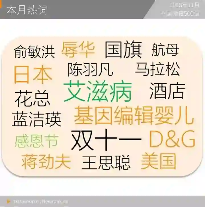 双十一再掀购物潮;“基因编辑婴儿”事件遭社会各界的强烈谴责;D&G辱华事件激发爱国热情;马拉松递国旗事件引发了体育圈甚至社会的强烈反响;王思聪挂帅的IG战队夺冠刷爆朋友圈;“花总”揭露多家五星级酒店的卫生问题、俞敏洪公开发表的女性堕落言论、陈羽凡吸毒事件同样引起热议。