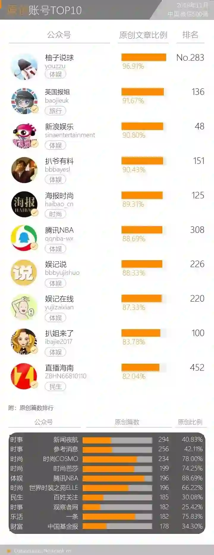 本月依旧未有100%原创账号,“柚子说球”的原创比例下降2.09%,仍以96.91%的原创比例卫冕冠军。