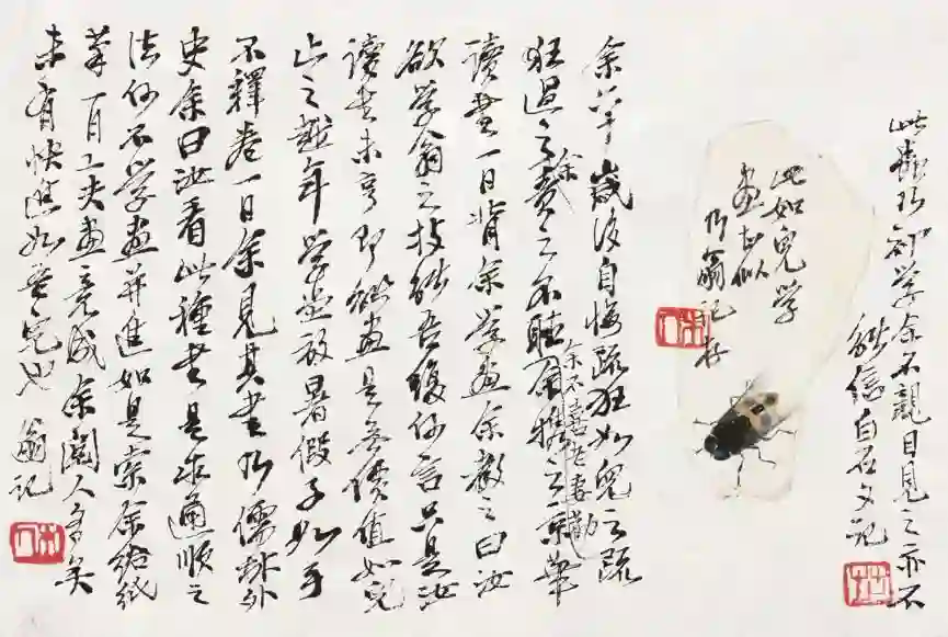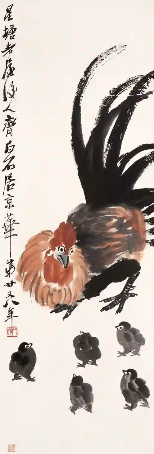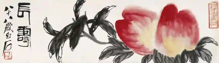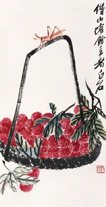 齐白石以陈师曾师傅吴昌硕为蓝本,创立了自己的艺术风格“红花墨叶”,杂糅自己以前精巧的工笔和大写意,称之为“工虫花卉”。