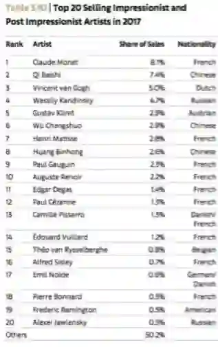 克劳德·莫奈(Claude Monet)是2017年该版块销售份额最高的艺术家,以1.86亿美元,占总销售额的8%。在年度拍卖纪录前20位中,莫奈的6件作品位列其中。
