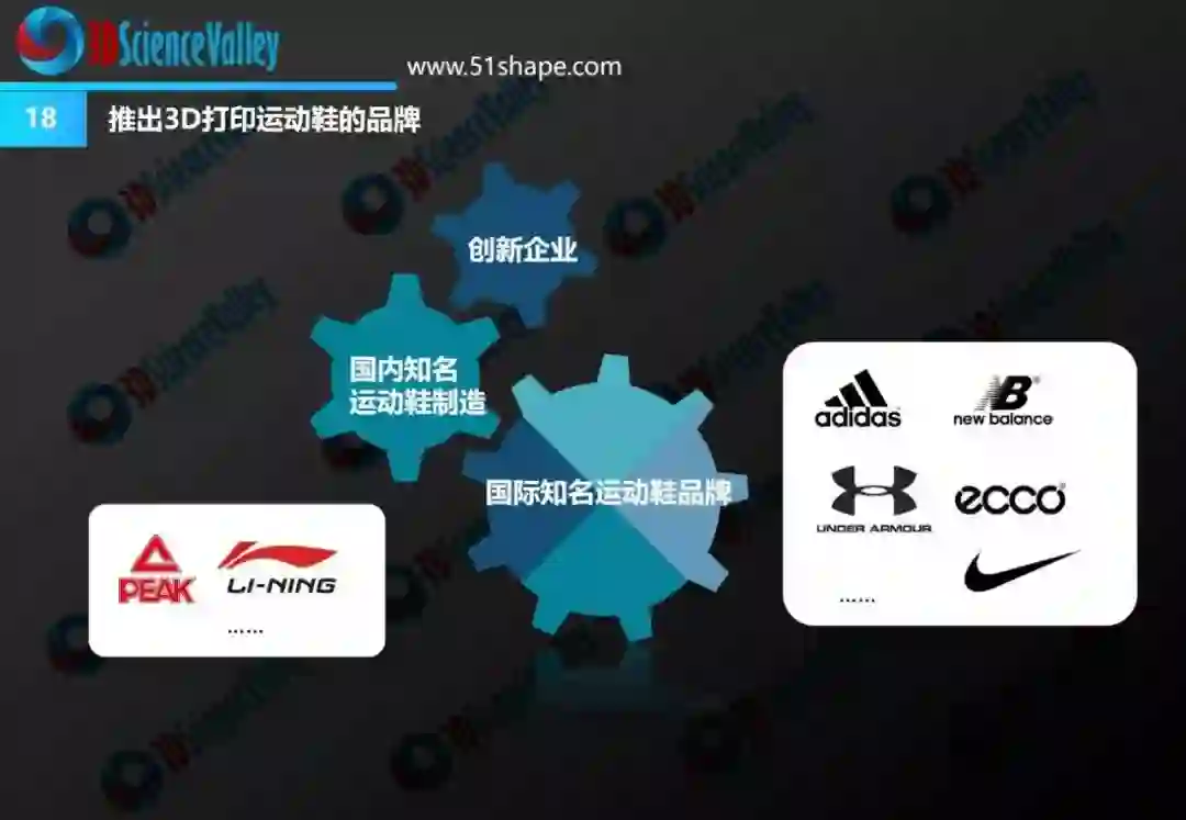 2017年以来,陆续登陆市场的几款带有3D打印鞋中底的运动鞋,例如阿迪达斯Futurecraft 4D,Under Amour Under Armour Architech,匹克Future I,都是运动鞋制造商在小批量定制化生产方面所进行的尝试。