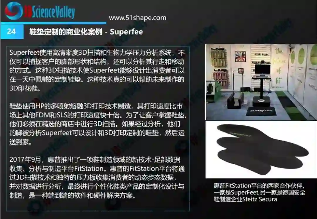 Superfeet 在鞋垫定制化生产中对3D打印技术有着深入应用,其推出的M3D 鞋垫就是通过惠普的多射流熔融(MJF) 3D打印设备制造的。