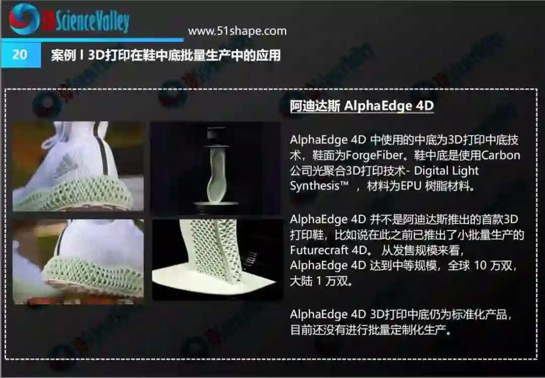 那么Speedfactory与3D打印的关系是什么呢?虽然目前并没有关于Speedfactory使用3D打印设备的报道。但Speedfactory生产的正是阿迪达斯的Futurecraft系列。而2017年4月,阿迪达斯对外推出Futurecraft 4D,世界第一双通过数字光合成技术制造的高性能鞋中底,并宣布计划2018年底生产超过100000双。数字化与自动化的结合,3D科学谷推理,根据数字化与自动化制造的结合点,如果不出意外,这一系列的鞋会首先落户于Speedfactory来生产。