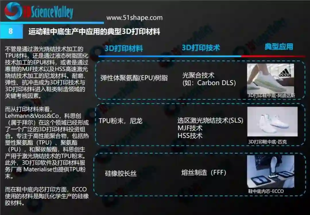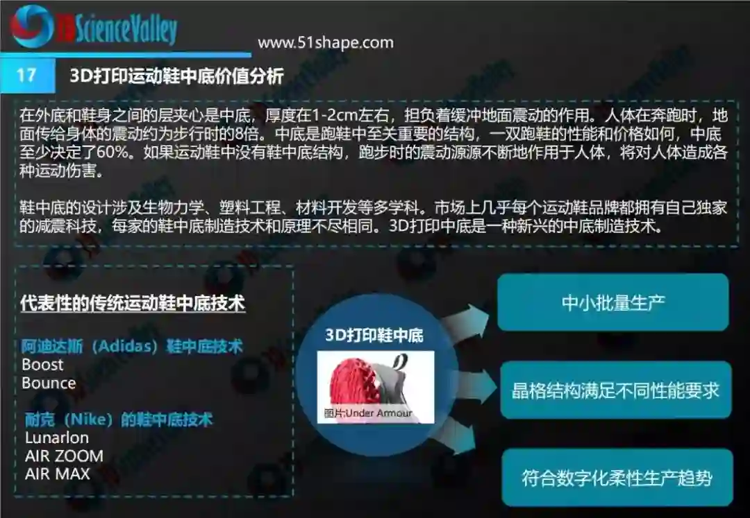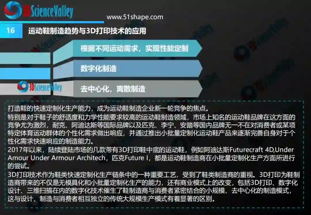 3D科学谷结合鞋制造技术和商业模式的发展趋势,在《3D打印与鞋制造技术白皮书1.0》中,对3D打印技术在鞋制造领域中的应用情况、应用价值、发展趋势等问题进行了剖析。