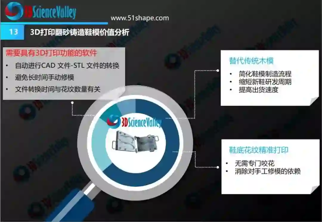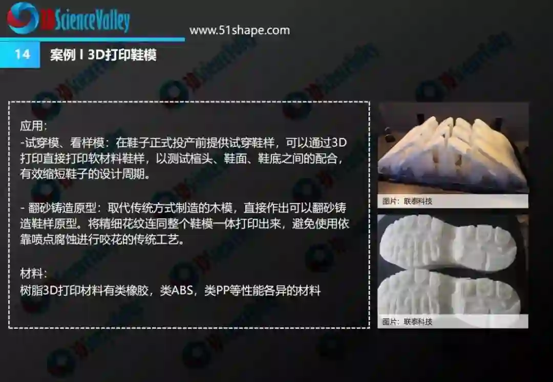 3D打印技术在鞋制造领域的应用主要包括:鞋模快速制造;鞋中底、鞋垫的中小批量生产,以及鞋面配件的小批量生产。这些应用将随着鞋制造企业向数字化技术的转型升级而逐渐加强。