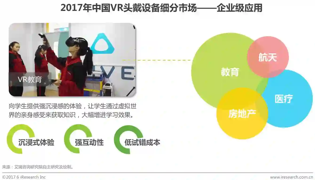 在VR的企业级应用当中,企业级解决方案(包括设备、软件开发、其他适配)的销售是现阶段主要的收入来源。VR技术可以应用于教育、医疗、房地产、航天等诸多领域,目前来看,头戴设备销售的重点领域集中在教育和培训需求上面。政府对教育信息化强有力的支持,以及教育体系自身的创新需要,共同驱动着VR教育垂直市场的发展。