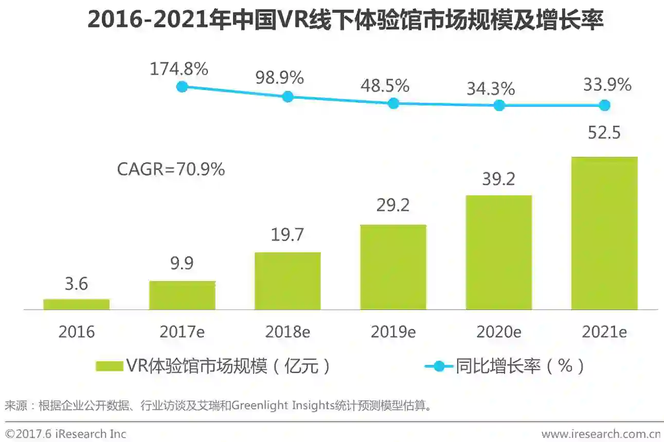 5. 从2015年开始兴起的VR体验馆,是目前中国VR市场中的核心部分。预计2021年,VR体验馆的市场规模将达到52.5亿元,占整体市场的7%。