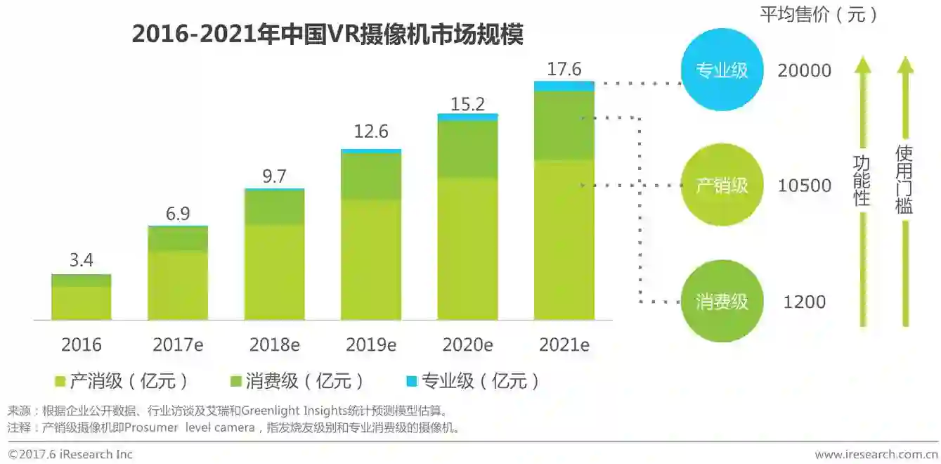 在中国,VR全景摄像机和其他VR摄像机正在缓慢的触达消费者和专业市场。对于消费级摄像机来说,由于大众对VR技术的意识薄弱,中国市场相比全球市场的销量会更低。由于企业级应用的增加,2019年起VR摄像机的销售量会开始快速上涨。产消级别的摄像机针对小型工作室或者独立制作人,这部分应用未来也会增长迅速。专业级的摄像机只会被大规模生产的厂房所使用,主要采取的是出租模式,所以预计这类功能丰富的VR摄像机的销量将会保持一个稳定的增速。