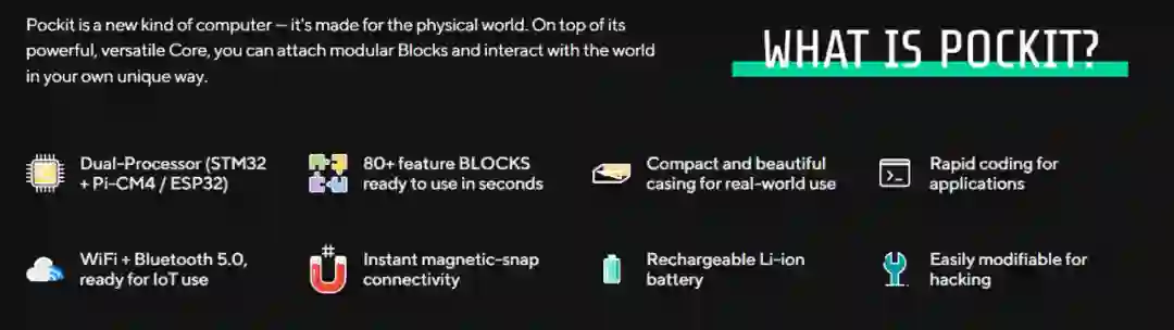 官方网站显示,Pockit 板具有双处理器支持,使用 ESP32 和带有 STM32 微控制器的 Compute Module 4。此外有超过 80 个模块,从编码器到 microSD 读卡器,再到各种摄像头、HDMI 接口、AI 加速器等等,它们都只需要用磁性连接到预先定义的网格上,然后仪表板就能自动检测出来。